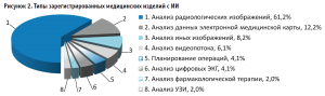 Абсолютное большинство зарегистрированных медицинских изделий с применением технологий искусственного интеллекта (30 МИ с ИИ) предназначены для анализа радиологических изображений – как для широкого спектра патологий (например, для анализа снимков КТ органов грудной клетки), так и конкретных заболеваний (диагностика инсульта). Это обусловлено тем, что компьютерное зрение среди технологий ИИ является одной из наиболее зрелых, а также полезных и понятных в применении для медицины. Кроме того, обучение ИИ-моделей для выявления артефактов на медицинских изображениях требует относительно небольших усилий – нужно лишь провести дополнительное обучение на специализированных наборах данных. Искусственный интеллект, выполняющий другие задачи, может потребовать разработки специальной архитектуры, что, в свою очередь, потребует больших затрат от компании-разработчика.