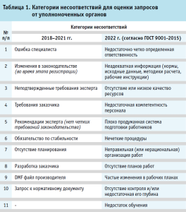 Для качественной оценки запросов от уполномоченных органов в контрактно-исследовательской организации на базе Системы обеспечения качества были разработаны категории несоответствий. В период с 2018 года по 2021 год категории сформулированы самостоятельно экспертами компании на основании анализа установленных несоответствий. В 2022 году по распоряжению генерального директора контрактно-исследовательской организации были изменены категории несоответствия согласно «ГОСТ Р ИСО 9001-2015. Национальный стандарт РФ1. Системы менеджмента качества. Требования».