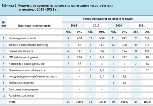 Таким образом, можно распределить все пункты запроса, касающиеся отдела работы с регуляторными требованиями, по критериям несоответствия по годам (табл. 2).