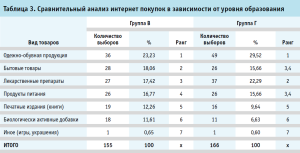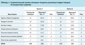 Сравнительный анализ интернет покупок различных видов товаров по возрастным группам представлен в таблице 1.