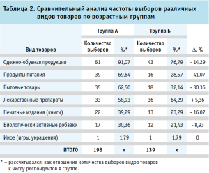 Ранжирование приобретаемых видов товаров в зависимости от возраста респондентов показал, что в обеих группах преобладает покупка одежно-обувной продукции. Второе и третье места у покупателей группы А занимают продукты питания и бытовые товары, а в группе Б – лекарственные препараты (2) и бытовые товары (3). Биологически активные добавки в обеих группах находятся на шестом месте. Сравнительный анализ частоты выборов различных видов товаров по возрастным группам представлен в таблице 2. Следует отметить, что общее число выборов различных видов товаров в группе А на 42% больше, чем в группе Б (общее число ответов по данному вопросу в группе А составило – 198, в группе Б – 139). Это указывает на некоторую сдержанность группы Б в использовании возможностей сети Интернет для совершения покупок.