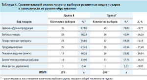 Сравнительный анализ частоты выборов различных видов товаров в зависимости от уровня образования представлен в таблице 4.