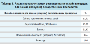 Анализ предпочитаемых респондентами онлайн площадок для заказа (покупки) ЛП приведен в таблице 5.