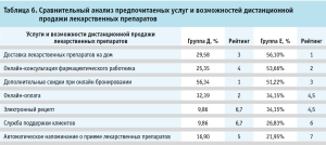 Анализ предпочитаемых услуг и возможностей дистанционной продажи ЛП был проведен в двух группах: Группа Д – респонденты, приобретавшие ЛП онлайн (n=71) и Группа Е – респонденты, не совершавшие покупок ЛП онлайн (n=41). Результаты анализа приведены в таблице 6.