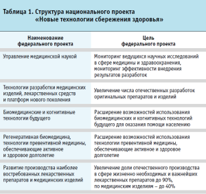 В здравоохранении это реализуется через национальный проект «Новые технологии сбережения здоровья», объединяющий усилия ведущих министерств и ведомств в пяти федеральных проектах (табл. 1).