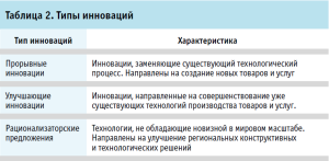Инновацию можно определить не только как новый или значительно улучшенный продукт, товар или услугу, но и как производственный фактор, который способствует росту и развитию экономики. Инновации разделяют на три типа (табл. 2.).