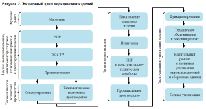 Жизненный цикл медицинских изделий представляет собой сложный, многоуровневый цикл и состоит из нескольких параллельных и последовательных фаз (рис. 2). Вначале предприятие должно изучить рынок спроса на изделие на момент его производства и его потребительские свойства, затем осуществить в короткий срок научно-исследовательские, опытно-конструкторские, технологические работы и проектирование конкурентоспособного изделия.