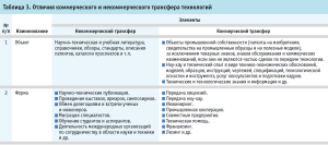 Что касается коммерческого трансфера, то в его основе лежат экономические отношения, с помощью которых инновация, разработанная в одной организации, становится коммерческим продуктом/ процессом, используемым другой организацией (табл. 3).