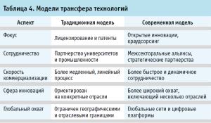 Традиционные модели были сосредоточены преимущественно на лицензионных соглашениях, патентах и технологическом сотрудничестве, современные – охватывают более широкий спектр деятельности (табл. 4).