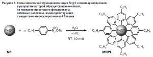 Перед специалистами по органической химии Томского политехнического университета была поставлена задача по поиску и разработке способа химической функционализации поверхности углеродного слоя наночастиц Fe@C, чтобы на выходе получить взаимодействие с веществом атеросклеротической бляшки человека. В результате такой работы был синтезирован нанокомпозит, на поверхности которого формировались активные химические радикалы со свойствами взаимодействия с веществом атеросклеротической бляшки (рис. 3, 4). В результате проведенной работы были получены российские и зарубежный патенты США [1–3].