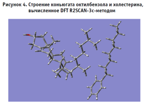На рисунке 4 показано строение полученного коньюгата. Квантово-химическим расчетом по методу DFT R2SCAN-3c определено, что липофильный алкильный хвост октилбензола имеет повышенное сродство к холестерину (прилипание). Можно полагать, что данное взаимодействие является одним из факторов, способствующих разрушению холестериновых бляшек.