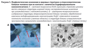 Последующий этап работы был посвящен сбору доказательной научной базы того, что синтезированные новые нанокомпозиты действительно способны химически взаимодействовать с субстратом атеросклеротической бляшки человека и изменять ее структуру. Учитывая, что рост самой бляшки в биологических объектах происходит по принципу этапного конвейера, то нам пока неизвестно, на какое конкретное звено этого синтеза могут оказывать влияние нанокомпозиты. На рисунке 5 (а, б) представлены морфологические результаты такого взаимодействия и документируются изменения в атеросклеротических бляшках и окружающих жировых структурах при их тесном контакте с имплантированными в них нанокомпозитами в экспериментах, которые были проведены in vivo и in vitro [4–6].