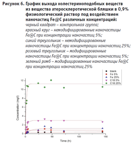 На рисунке 6 представлен график выхода холестеролоподобных веществ в физиологический раствор из атеросклеротических бляшек человека при их контакте с нанокомпозитами в основной и контрольных группах в эксперименте in vitro [5]. Этот эксперимент доказывает, что нанокомпозиты активно химически взаимодействуют со структурой атеросклеротической бляшки человека.