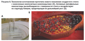 В последние годы значительное внимание уделяется разработке инновационных нанокомпозитных покрытий для стентов, влияющих на процессы тромбообразования и рестеноза. Процесс роста атеросклеротической бляшки в организме человека происходит на клеточно-молекулярном уровне (рис.1). Нанокомпозитные частицы с соответствующими функциональными группами на поверхности могут влиять на этот процесс, замедляя или останавливая его. Подбор соответствующих композитов и покрытий требует проведения углубленных исследований химического взаимодействия нанокомпозитов с субстратом самой атеросклеротической бляшки.