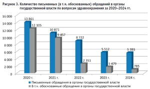 Из представленных данных видно, что количество письменных обращений в органы государственной власти, включая обращения в МЗ АК, снизилось с 2020 к концу 2024 года в 2,5 раза. Наиболее значимое снижение (37%) отмечается в 2023 году. Количество же обоснованных обращений в органы государственной власти снизилось с 2020 к концу 2024 года в 15,4 раза (в т.ч. в сравнении с 2022 годом – в три раза). При этом доля обоснованных письменных обращений в 2024 году уменьшилась в шесть раз в сравнении с 2020 годом.