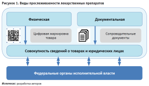 На современном этапе законодательство РФ активно поддерживает внедрение технологий прослеживаемости как комплекса мероприятий, обеспечивающих регистрацию движения товаров по товаропроводящей сети с момента нанесения средства идентификации или контрольного (идентификационного) знака, а также автоматизированное предоставление юридически значимых сведений о совершенных операциях с единицей товара и их обработку в ГИС [12]. На рисунке 1 представлены виды прослеживаемости ЛП. Введенные в гражданский оборот ЛП имеют прослеживаемость, физически выраженную в коде DataMatrix на упаковке и документально подтвержденную сопроводительными документами в электронном виде или на бумажном носителе.