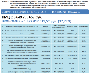 В рамках реализации федерального проекта «Развитие федеральных медицинских организаций, включая создание и развитие сети национальных медицинских исследовательских центров с целью их оснащения современным медицинским оборудованием» на текущий момент проведено одиннадцать совместных аукционов. Общая сумма заключенных контрактов составила 3,64 млрд рублей. Благодаря оптимизации закупочных процедур и эффективному управлению тендерными процессами достигнута значительная экономия бюджетных средств, составившая 1,37 млрд рублей, что представляет собой процентное соотношение в размере 37,7% (рис. 3). Эти результаты свидетельствуют о высокой эффективности проведенных мероприятий и могут служить основой для дальнейшего совершенствования механизмов государственного заказа в сфере здравоохранения.