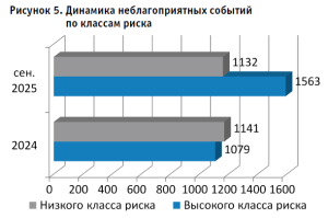 О значительном повышении уровня информированности среди участников системы, особенно среди медицинского персонала, свидетельствует анализ данных, интегрированных в автоматизированную информационную систему здравоохранения. К сентябрю 2025 года количество сообщений о нежелательных явлениях, связанных с использованием медицинских изделий, достигло уровня, зафиксированного по итогам предыдущего года (рис. 4). Важно отметить, что наблюдается существенный рост числа сообщений о неблагоприятных событиях, связанных с применением медицинских изделий высокого класса риска (рис. 5). Однако данная тенденция обусловлена интенсификацией мониторинга и отчетности в этой области среди субъектов обращения медицинских изделий, а не снижением их качества.