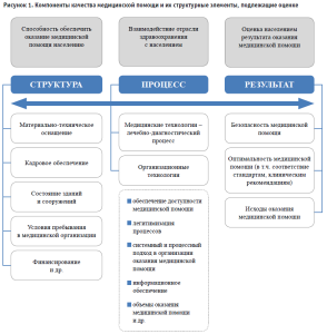 Используя модель А. Донабедиана, качество медицинской помощи можно дифференцировать на компоненты и входящие в них структурные элементы, каждый из которых может быть подвергнут оценке (рис. 1).