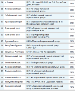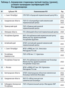 По состоянию на 1 января 2025 года, в Российской Федерации 29 акушерских стационара третьей группы (уровня) получили сертификат соответствия требованиям Практических рекомендаций (табл. 1).