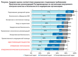 По результатам внешней оценки, в сертифицированных акушерских стационарах средний уровень соответствия требованиям Практических рекомендаций составляет всего 71%, с наименьшими значениями по направлениям «эпидемиологическая безопасность», «управление стационаром» и «идентификация пациентов».